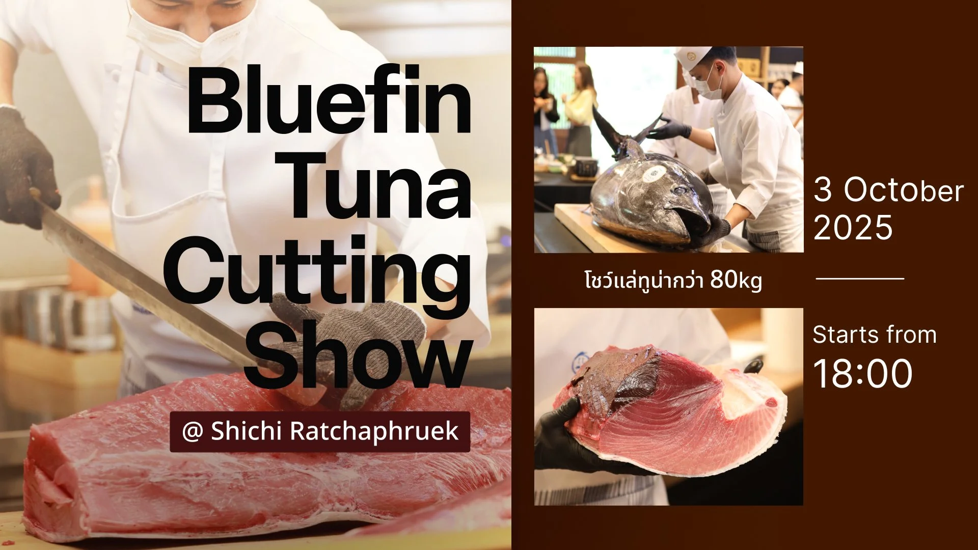 เตรียมพบกับประสบการณ์พิเศษที่คนรักอาหารญี่ปุ่นไม่ควรพลาด Shichi สาขาราชพฤกษ์ ขอเชิญทุกท่านเข้าร่วมกิจกรรม Bluefin Tuna Cutting Show ในวันที่ 3 ตุลาคม 2568 เวลา 18.00 น. พบกับปลาทูน่าบลูฟินสดขนาดยักษ์กว่า 80 กิโลกรัม ที่จะมาสร้างความตื่นตาตื่นใจด้วยการสาธิตการแล่สดๆให้ชมแบบใกล้ชิด