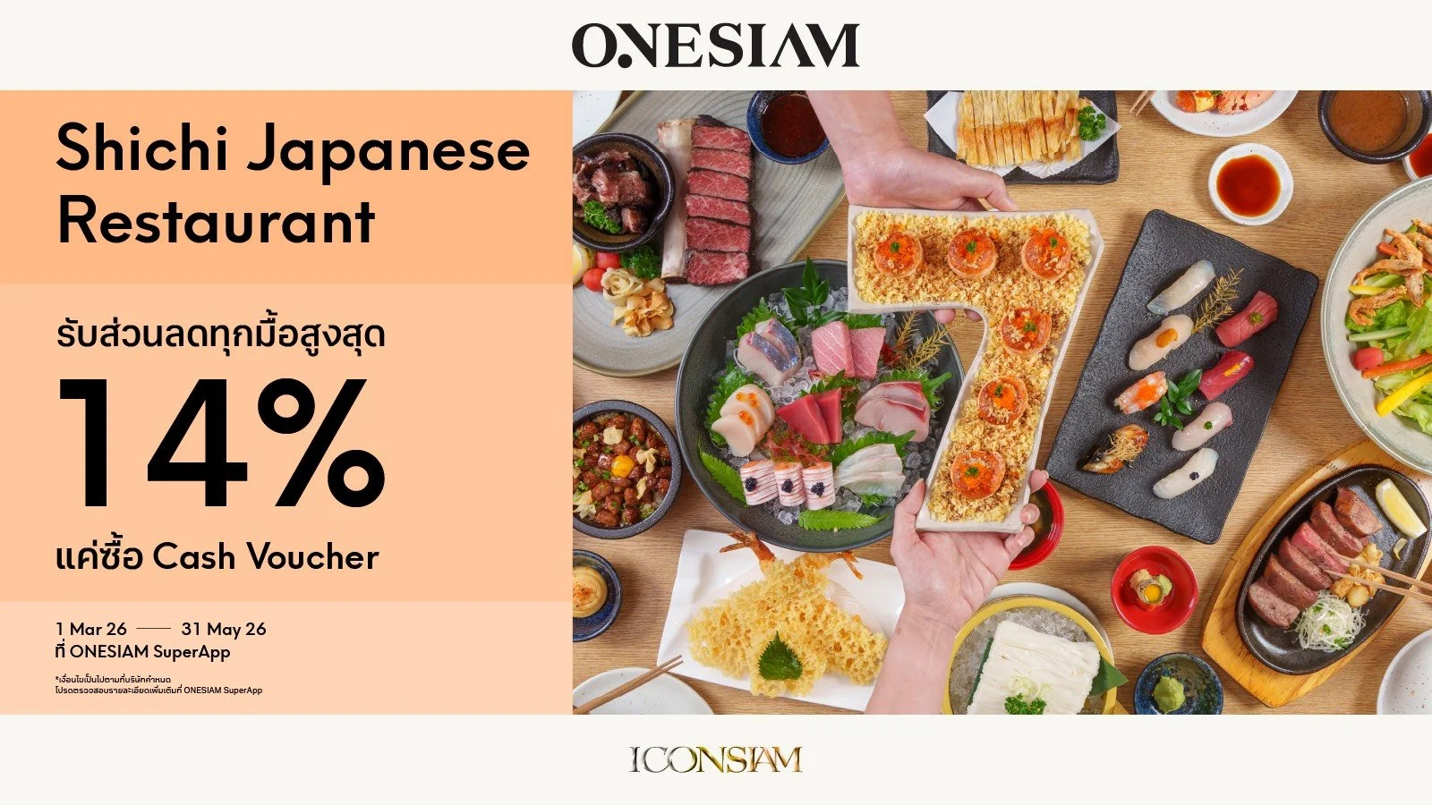 ยกระดับความคุ้มค่าให้กับทุกมื้ออาหาร กับโปรโมชันพิเศษ เพียงซื้อ Cash Voucher Shichi Japanese Restaurant มูลค่า 1,000 บาท ผ่าน OneSiam SuperApp ก็สามารถรับส่วนลดสูงสุด 14% ได้ทันที ให้ทุกครั้งที่มาทาน Shichi คุ้มกว่าที่เคย