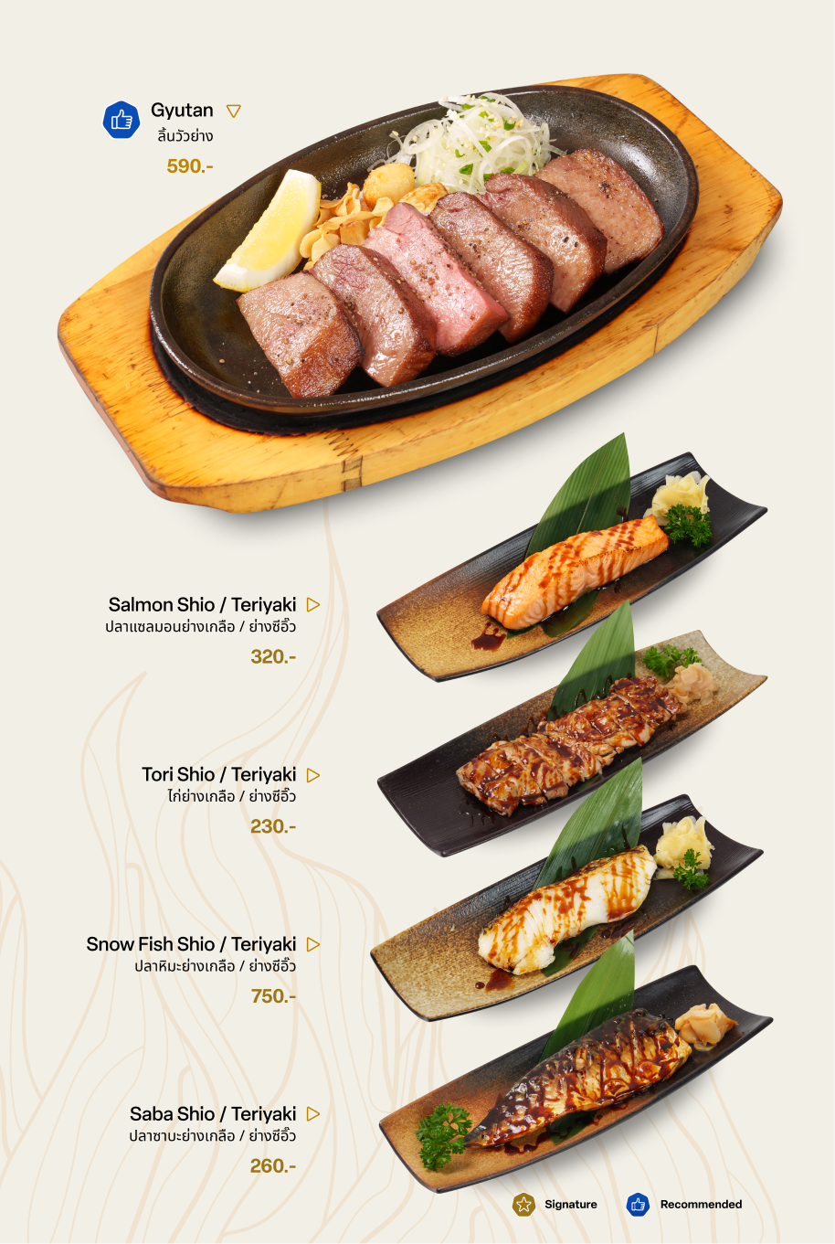 Shichi Japanese Restaurant Menu: Five grilled dishes: Gyutan, Salmon Shio/Teriyaki, Tori Shio/Teriyaki, Snow Fish Shio/Teriyaki, and Saba Shio/Teriyaki, each displayed with its name, description, and price.